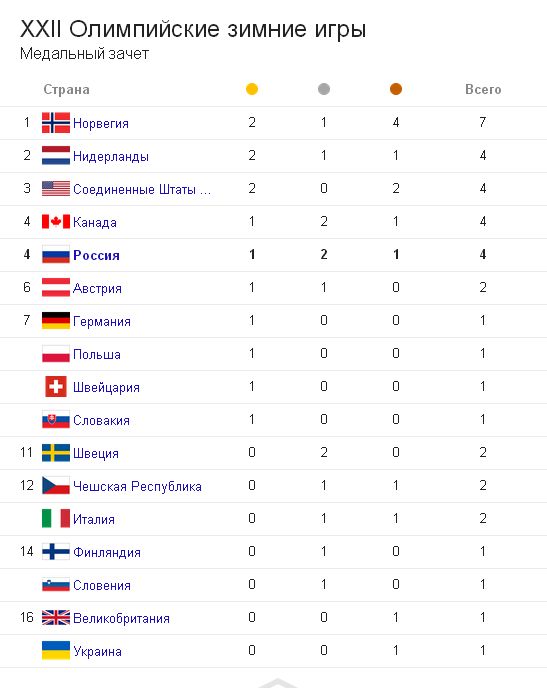 Промежуточные итоги Олимпиады-2014 (10 февраля 06:52 – время Сочи, 09:52 – в Бийске). Источник: Google.ru